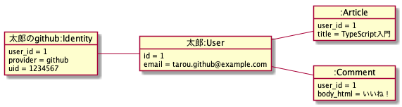 ユーザー"太郎"がGithubアカウントを使ってソーシャルログインをして、記事とコメントを投稿した状態を表しています。
