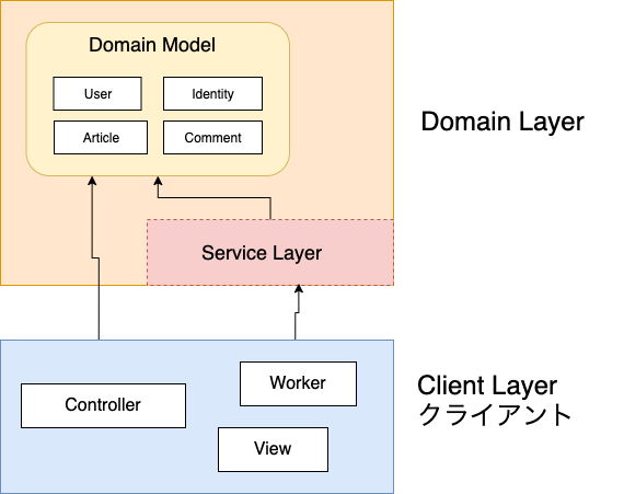 細かい粒度のModelがあり、それらを制御する中くらいの粒度のServiceがあり、クライアントであるControllerやWorkerはServiceの簡潔なインターフェースを通してDomain Layerとやり取りをしていました。