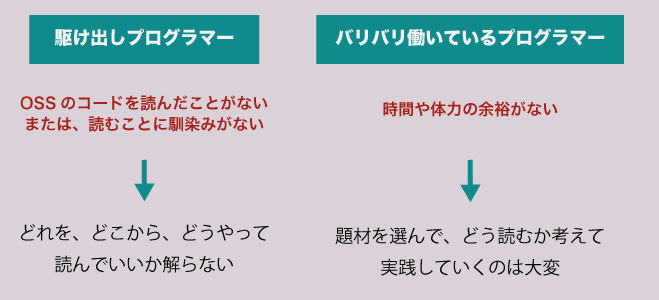 一方で、実際にOSSのコードから学ぼうとすると次のような問題があるように思います。