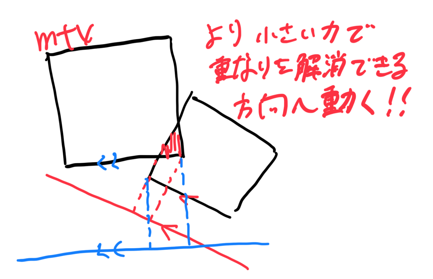 基本的には、①動く→②当たる→③めり込んだ分を補正するの流れ。①と③を分けて処理をしないと、せっかく計算したmtvが上手く機能しなくなる。