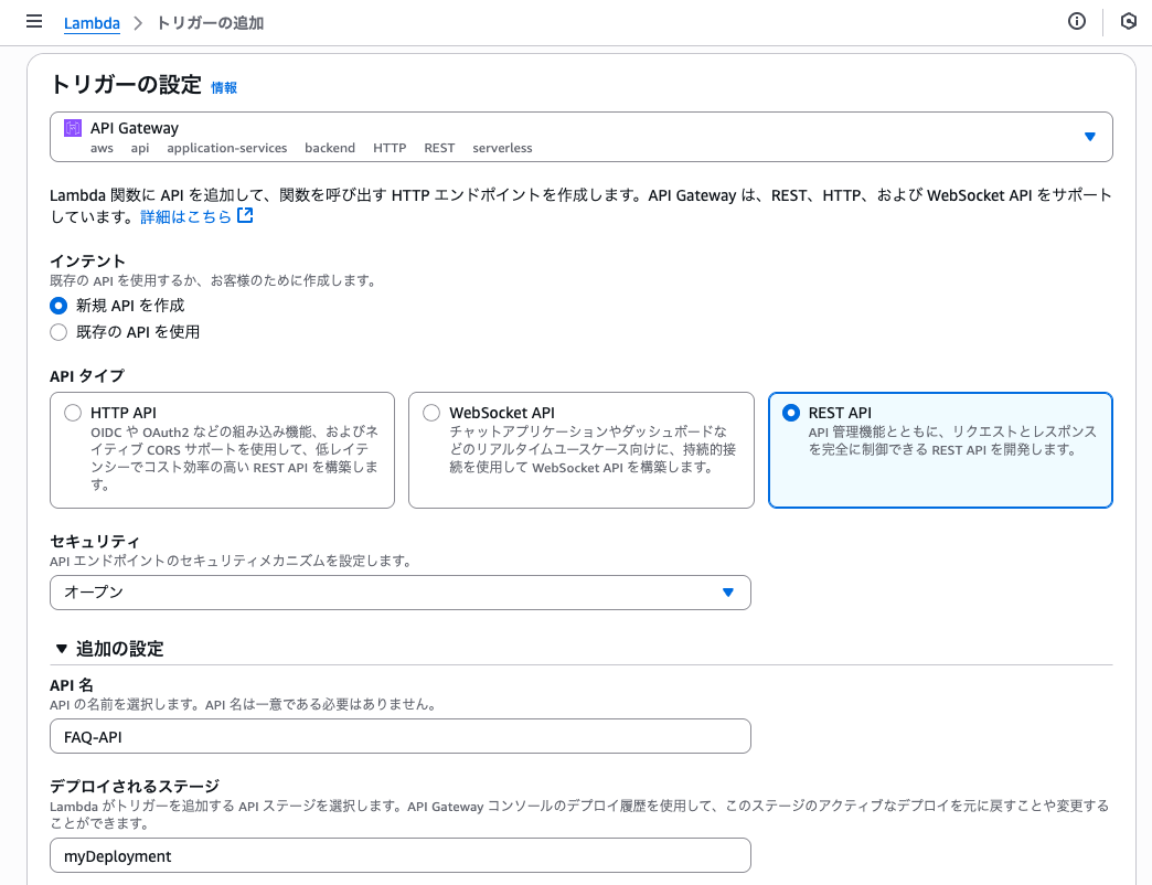 API Gateway に対して呼び出しが行われるたびに Lambda 関数をトリガーします。 - トリガーの設定「API Gateway」>インテント「新規APIを作成」>APIタイプ「REST API」