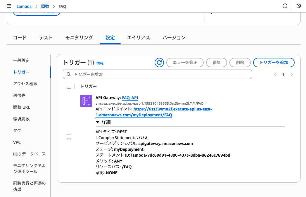 Lambda 関数を作成し、設定できました。また、Lambda 関数のトリガーに使用する新しい API Gateway REST エンドポイントを作成しました。