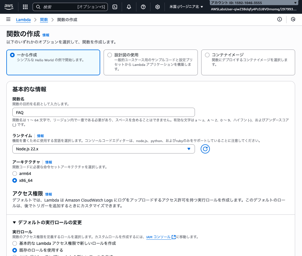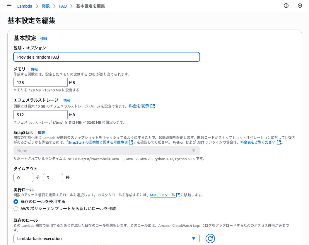 デフォルトの実行ロールの変更>既存のロースを使用する>既存のロール「lambda-basic-execution」を選択