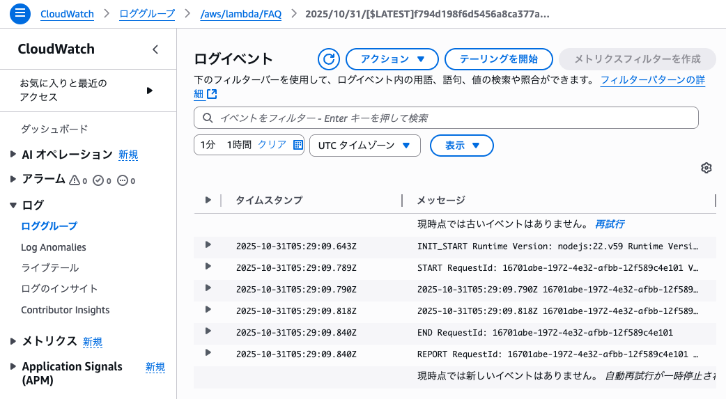 「モニタリング」タブ>「CloudWatchログを表示」>ログストリーム