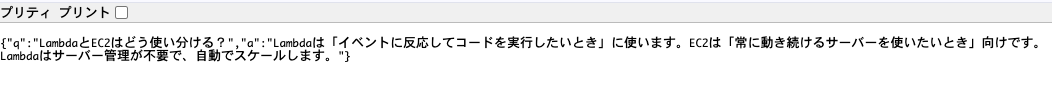 - Lambda が質問と回答の JSON を作り、API Gateway に返す