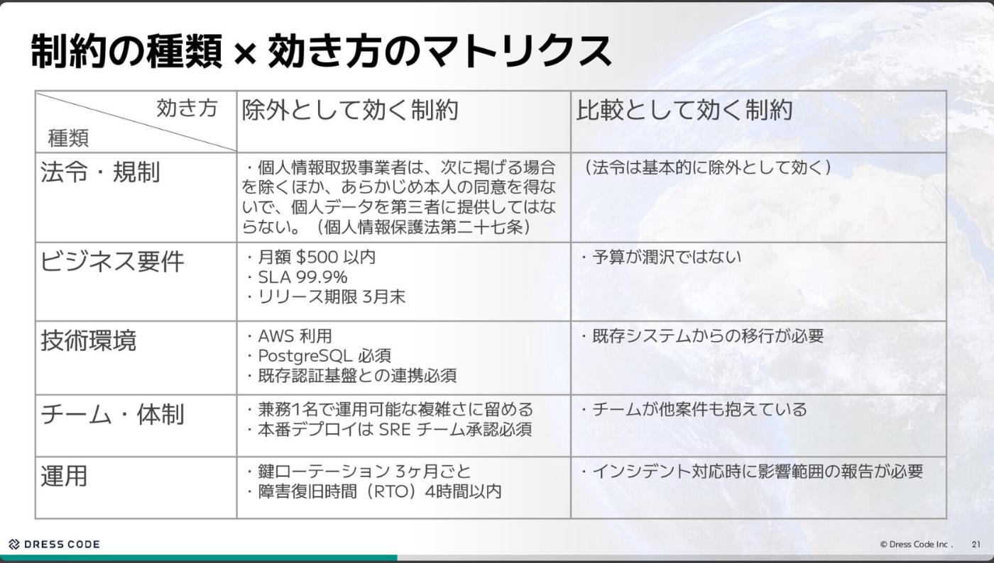 このLTではプロダクト固有の法令や技術スタック、チームの体制などの制約から設計を絞り込む手法について共有し、後半ではこの手法によって絞り込んだ選択肢から判断するためのプラクティスも紹介されていました。