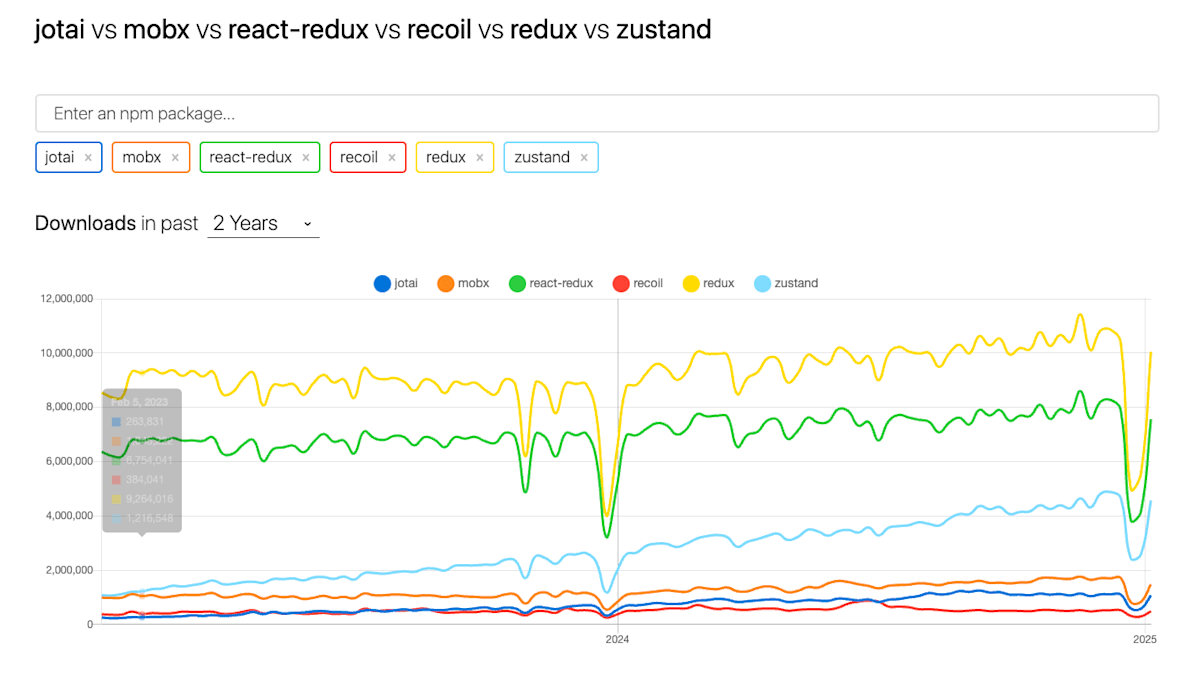 https://npmtrends.com/jotai-vs-mobx-vs-react-redux-vs-recoil-vs-redux-vs-zustand
