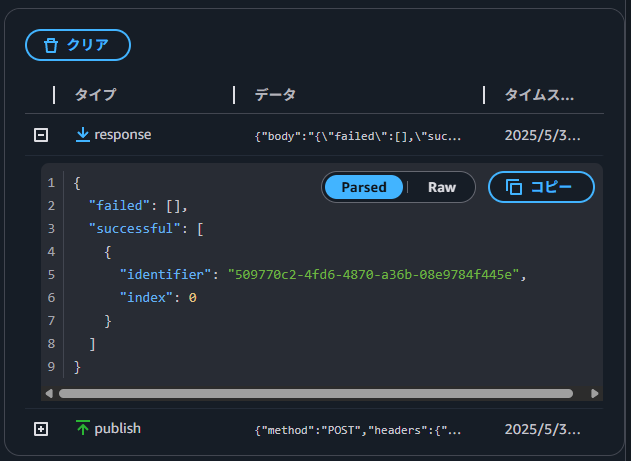 試しにメッセージをPublishしてメッセージがDynamoDBに保存されるか確認してみましょう。