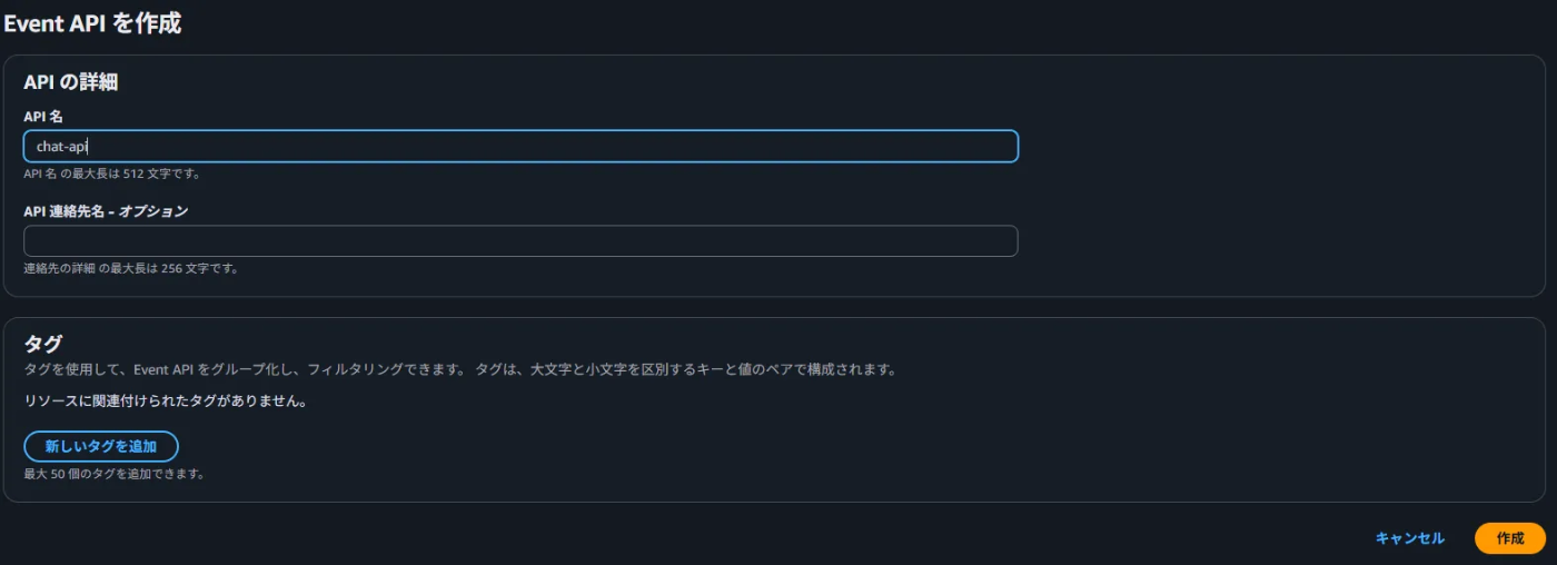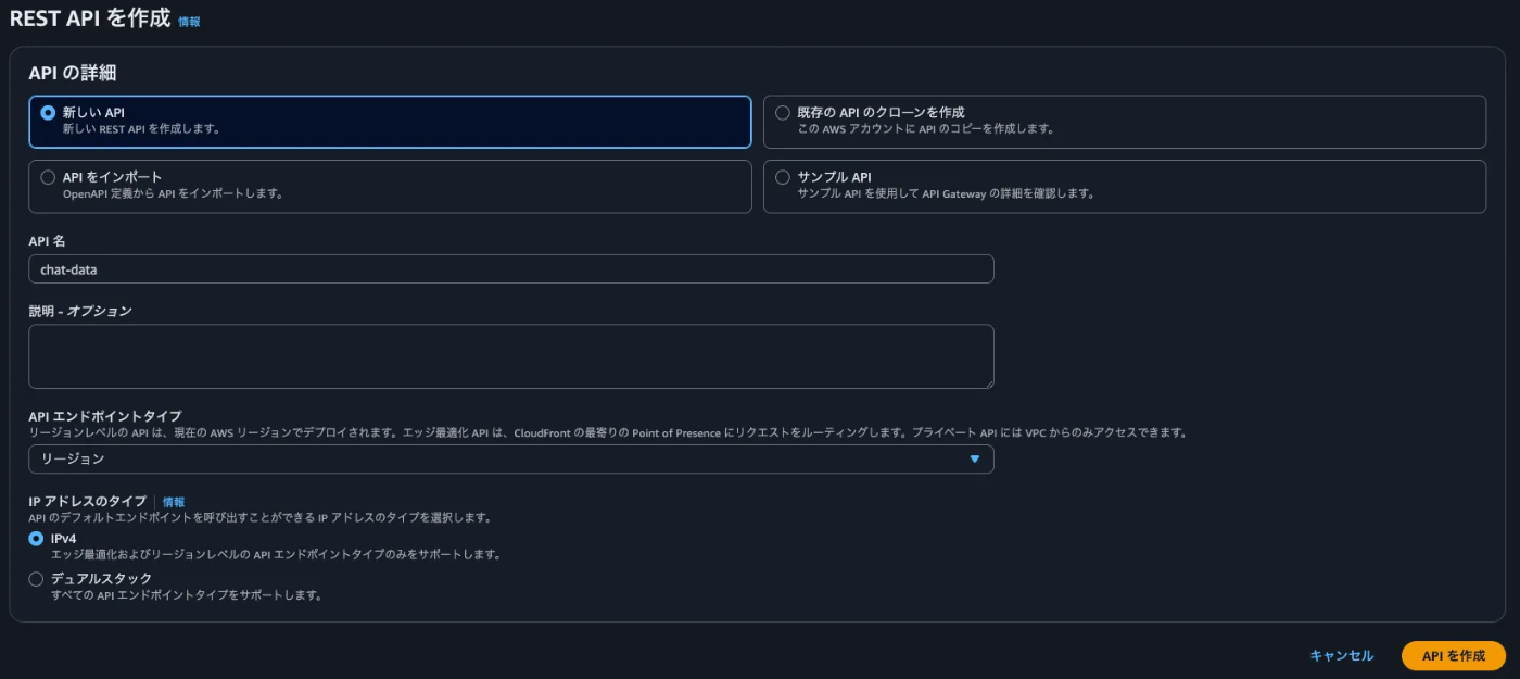 API名は chat-app とし、他の設定は特に変更せず 作成 をクリックします。