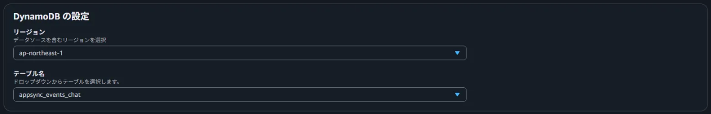 ここで、先程作成したDynamoDBのテーブルを作成したリージョンを選択し、テーブル名から appsync_events_chat を選択します。