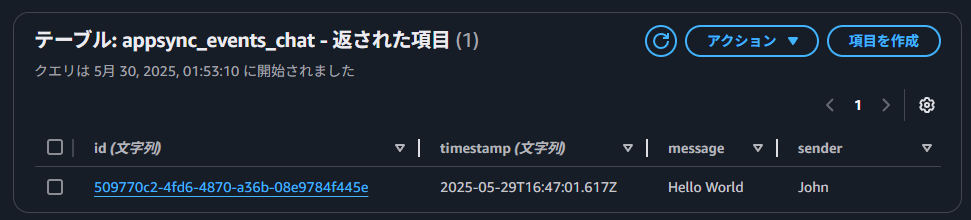 DynamoDBのテーブルを確認すると、先程Publishしたメッセージが保存されていることが確認できます。