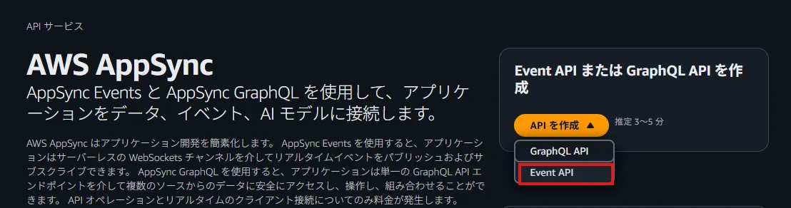AWSマネジメントコンソールからAppSyncのサービスを開き、 APIを作成 のプルダウンをクリックし、 Event API を選択します。