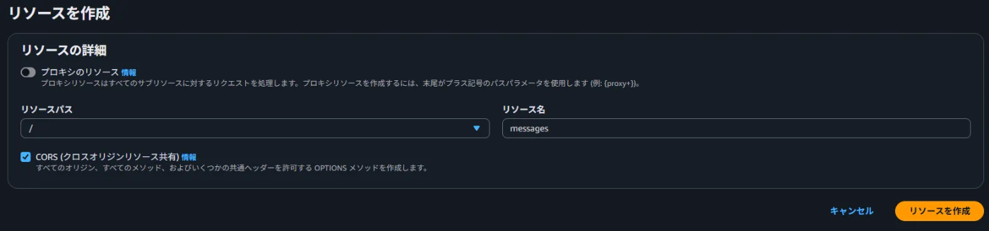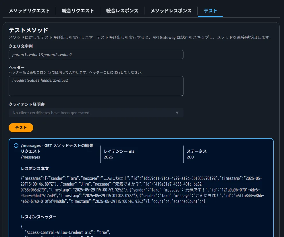 DynamoDBと連携して送信したメッセージを保存してWebSocketで送信されたメッセージをリアルタイムに受信できるようにします。あとからチャットに入ったユーザーも過去のメッセージを取得できるようにするため、DynamoDBからチャットのメッセージを取得するためのAPIはLambdaで作成します。