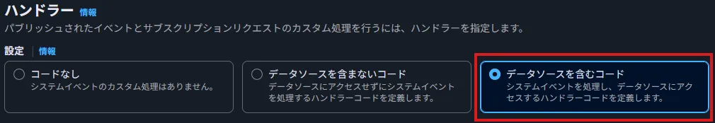 ハンドラーの設定では、 データソースを含むコード を選択します。