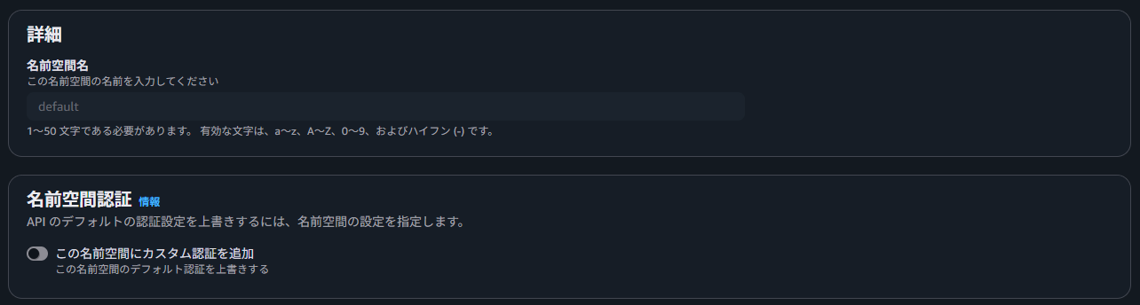 名前空間を作成 をクリックして、名前空間名を default とし、名前空間の認証は特に設定しません。