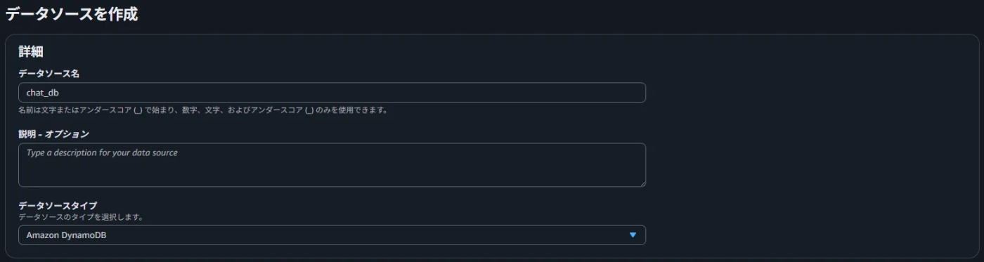 任意のデータソース名を定義し、データソースタイプの中から Amazon DynamoDB を選択します。