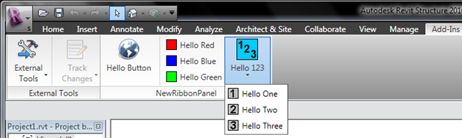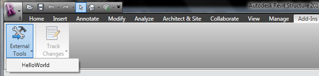 Revit の UI に新しいコマンドを追加できます。これらのコマンドは「アドイン」タブの「External Tools」プルダウンに表示されます(図1参照)。外部ツールコマンドは、Revit のデータベースおよび現在選択されている要素にアクセスできます。