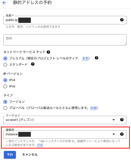 静的アドレスの予約にて接続先にVMインスタンスを指定してください。