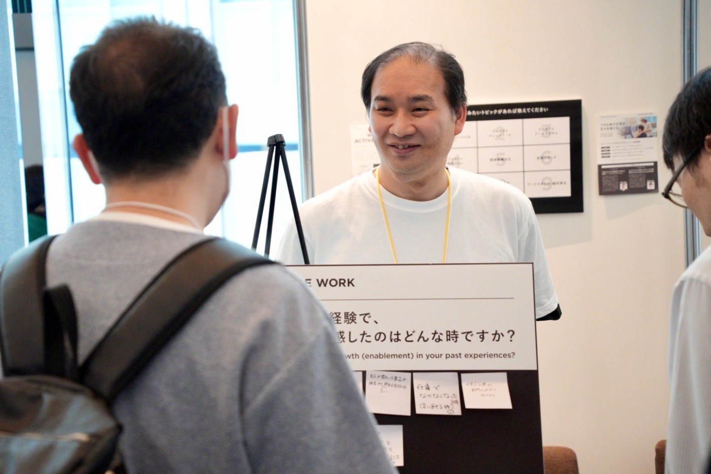 ブース脇にはスタンドパネルを設置し、「あなたがこれまでの経験で、成果や能力の向上(イネーブルメント)を最も実感したのはどんな時ですか?」というお題に対して、ブース訪問者のみなさまにご記入いただきました。この仕掛けを通して、ナレッジワークのコアである「イネーブルメント」という概念について、来場者のみなさまに少しでも実感いただけたのであれば幸いです。(なお、このボードは、ナレッジワークが技術カンファレンスに協賛するたびに毎回設置しており、カンファレンスごとのテーマに応じた傾向の違いや、参加者の皆さまの価値観が垣間見える場となっています。スタッフ一同、毎回付箋に書かれた内容を拝見するのを楽しみにしております。)