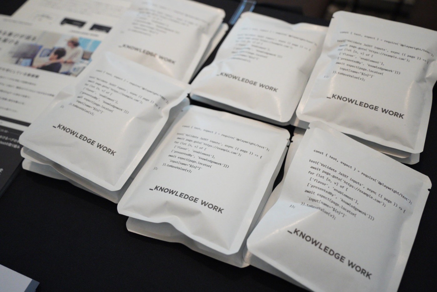 解説は野暮ではありますが、「イネーブルメント味のコーヒーを、ナレッジワークが提供します」というメッセージを、E2E(エンドツーエンド)テスト自動化ツールであるPlaywrightのテストスクリプトとして表現しました。ブースでお渡しした方からは大変好評をいただき、ブーススタッフとのコミュニケーションの促進にも貢献しました。