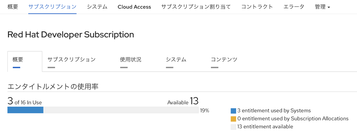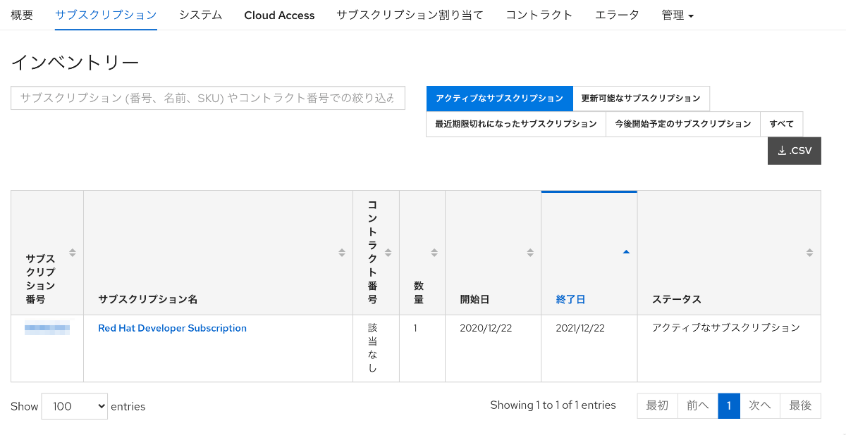 そこをクリックしてサブスクリプション名が"Red Hat Developer Subscription"なことを確認します。