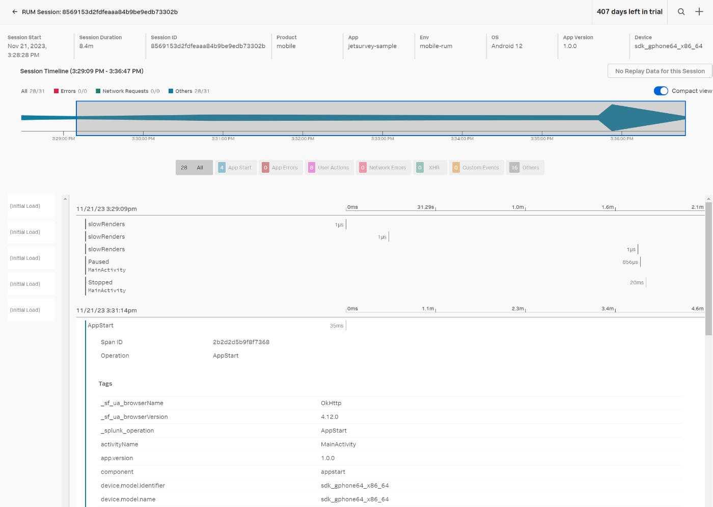 2023-11-21 15:26:11.939 12642-12877 LoggingSpanExporter com.example.compose.jetsurvey I 'AppStart' : 5c8c3e724f119acbd7feb6e62b81ccc9 0bb66cd7129caf0a INTERNAL [tracer: SplunkRum:] AttributesMap{data={start.type=cold, app.version=1.0.0, session.id=244482e977893c45a84b9223305ea60b, network.carrier.mcc=310, network.connection.type=wifi, network.carrier.icc=us, network.carrier.mnc=260, screen.name=unknown, component=appstart, network.carrier.name=T-Mobile - US}, capacity=128, totalAddedValues=10}