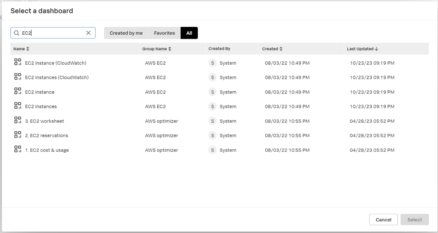 "Add dashboard" を押して、"EC2" を検索ワードにすると、デフォルトで利用可能なダッシュボードが表示されます。この中に「1. EC2 cost & usage」というダッシュボードがありますね。