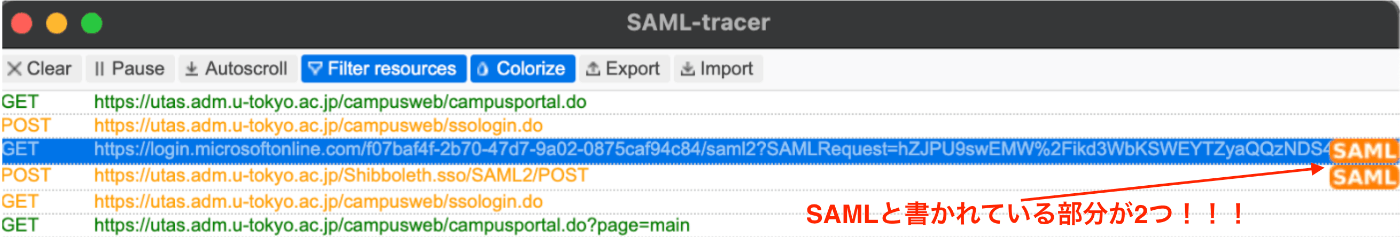 SAML Tracerを起動して大学の自分のページにアクセスを試みました。