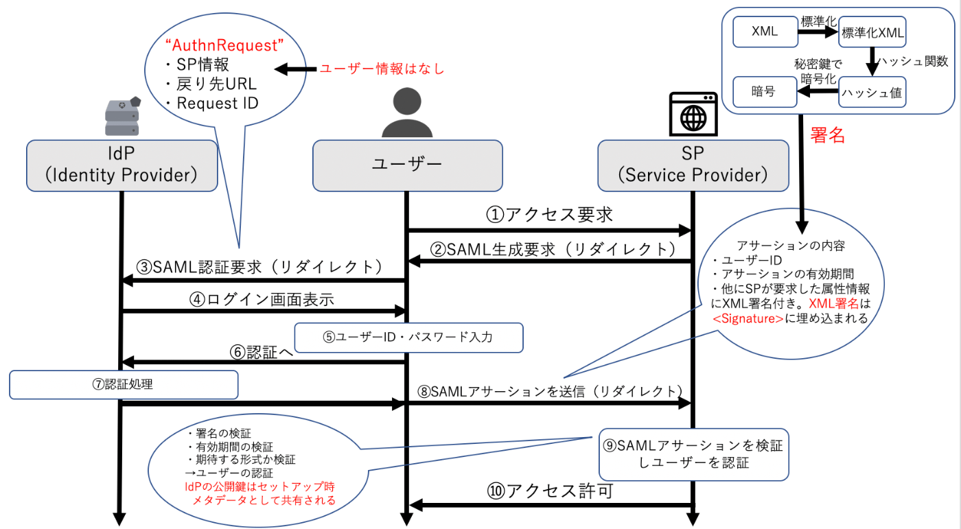 というような情報です。このSAMLアサーションは署名付き(IdPの秘密鍵での署名)で、受け取ったSPはその署名が適切か(本当に依頼したIdPから来たものなのか)を検証します。