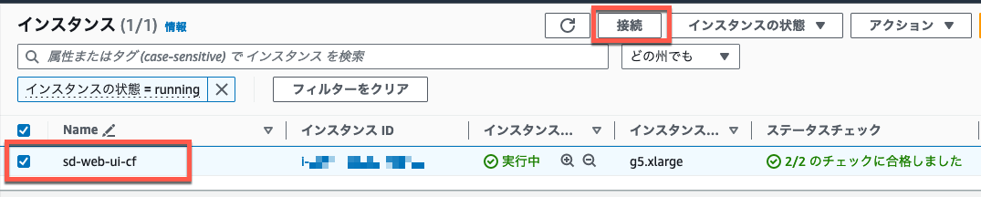 起動している sd-web-ui-cf インスタンスにチェックを入れて、接続 を押します