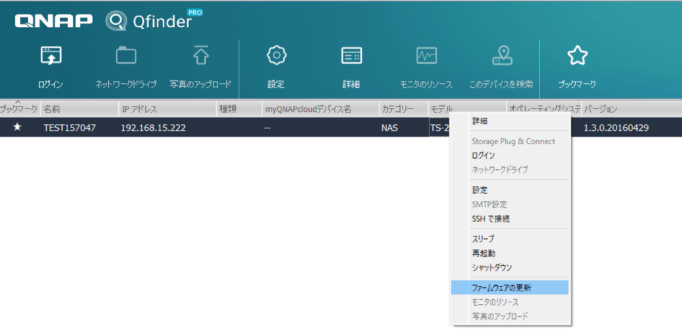 検出されたNASをリストから選択し、右クリックメニューから[ファームウェアの更新]を選びます。