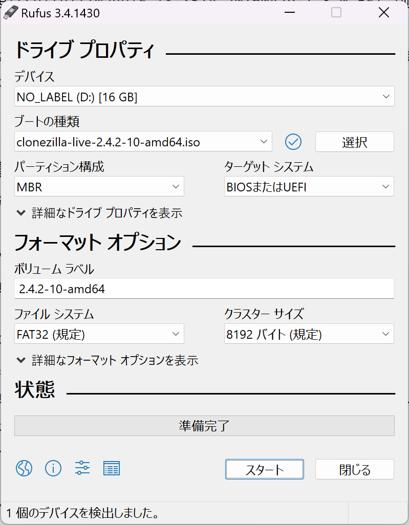 USBメモリを作業用PCに接続し、rufusを起動します。