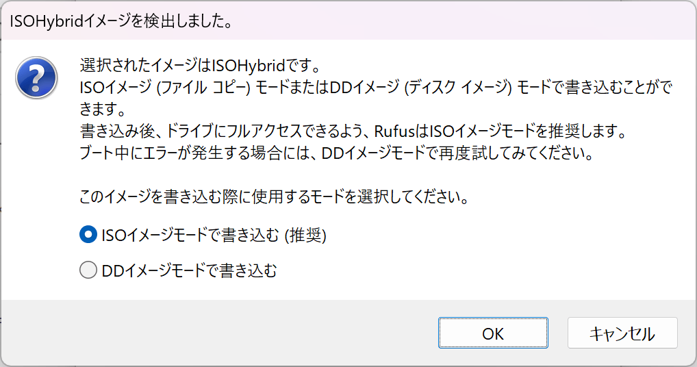 指定が終わったら[開始]をクリックします。以下のようなダイアログが表示されるので、[ISOオードで書き込む]を指定し、[OK]をクリックします。