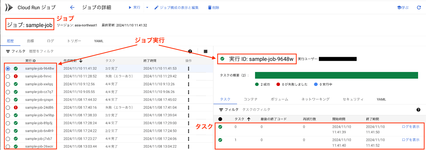 Cloud Run Job の実行における説明では、「ジョブ」「ジョブ実行」「タスク」という3つの用語が登場する。