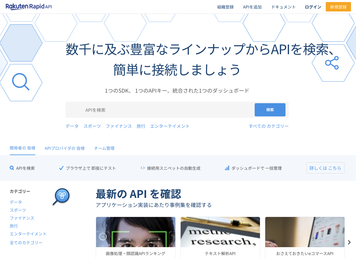 Rakuten RapidAPI は、開発者が API を検索・接続し、利用状況を管理できる API マーケットプレイスです。ご自身のプロジェクトに必要な API を検索してアプリに埋め込み、ダッシュボードで API の利用状況が一括管理できます。