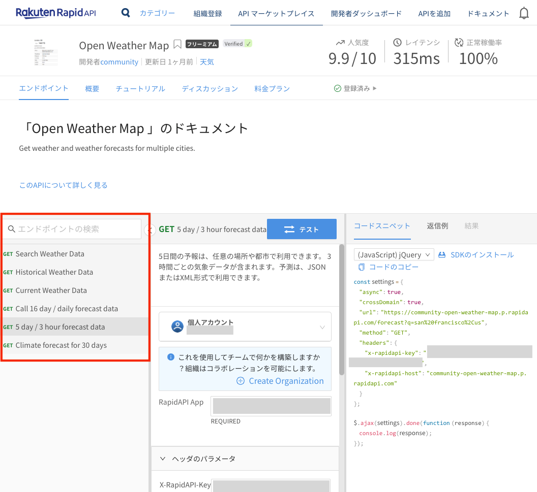 今回は「Open Weather Map」で検索して、大元の API を探しました。