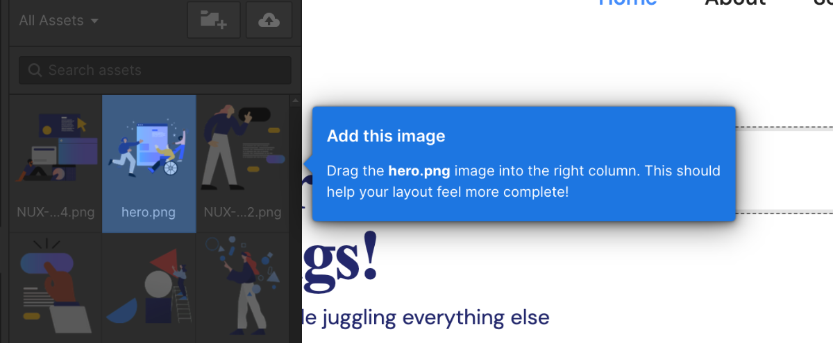 hero.pngの画像を右のカラムにドラッグ&ドロップします。