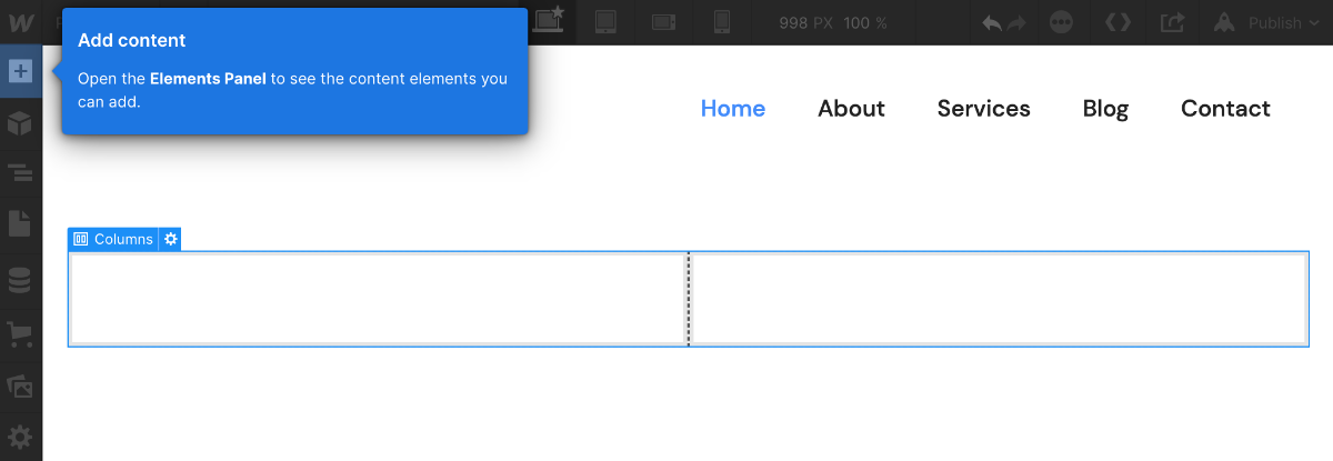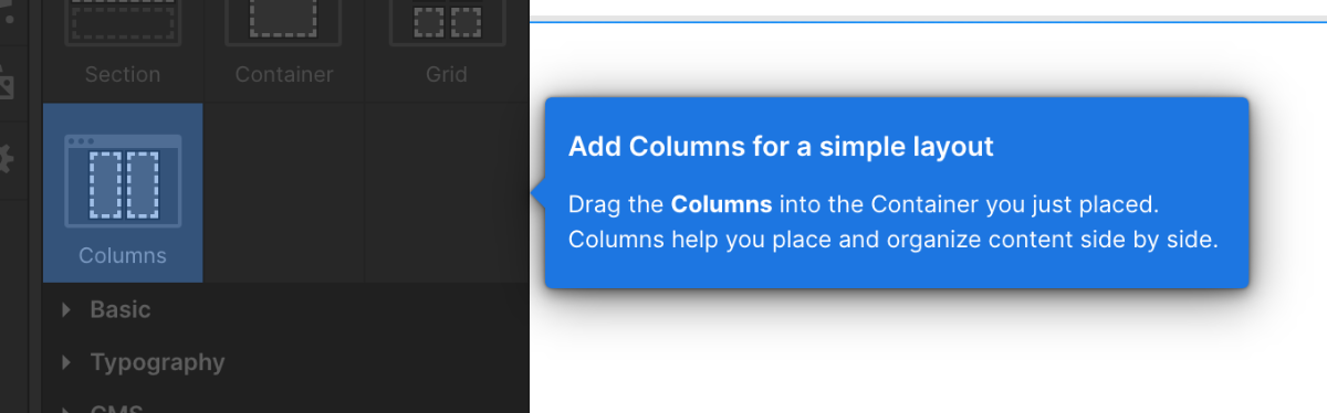 エレメントパネルからカラムのレイアウトをドラッグして先ほどのContainer要素にドロップします