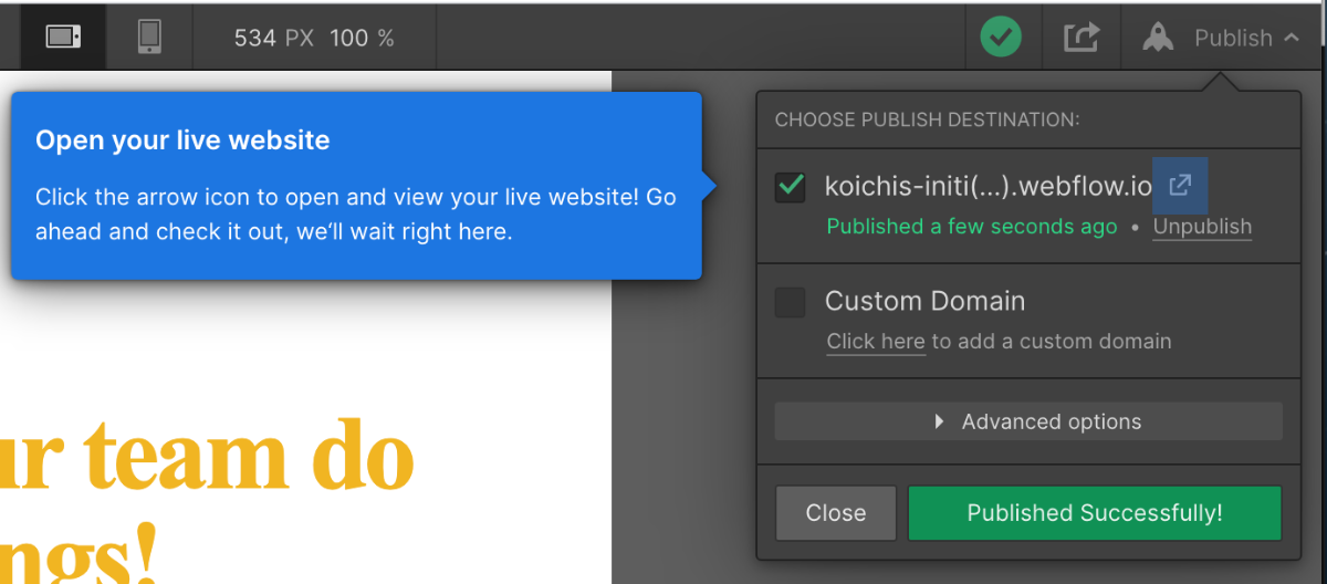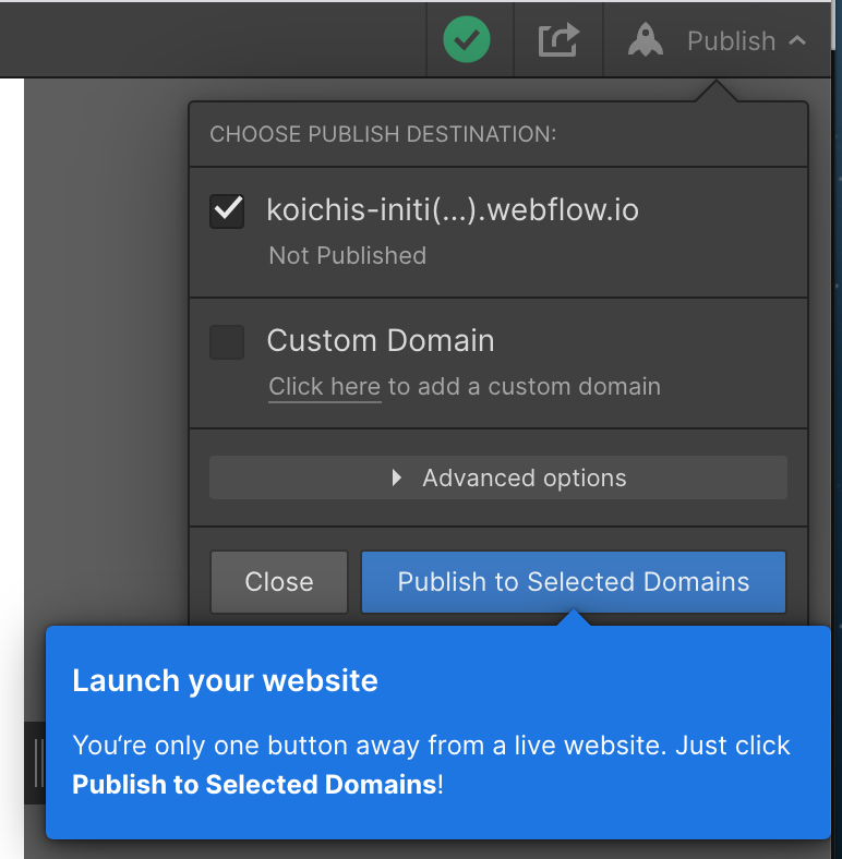 デプロイ先を選ぶ事ができるのですが、チュートリアルではWebflowが提供しているドメインを使用します。
