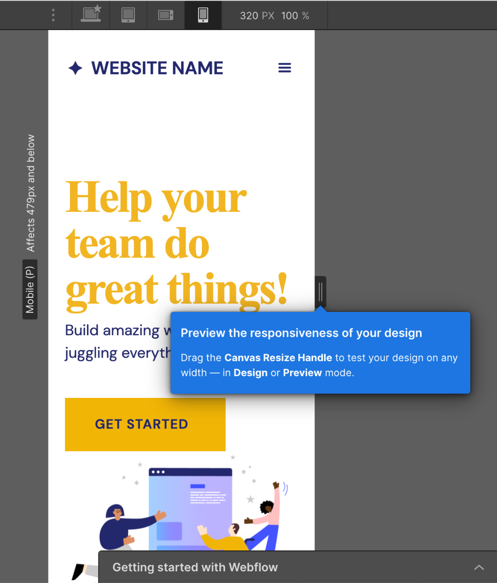 また、プレビュー画面の右に引っ張る事ができるアイコンがついているので、それをドラッグすることで、任意の画面幅で作成したサイトを確認する事ができます。