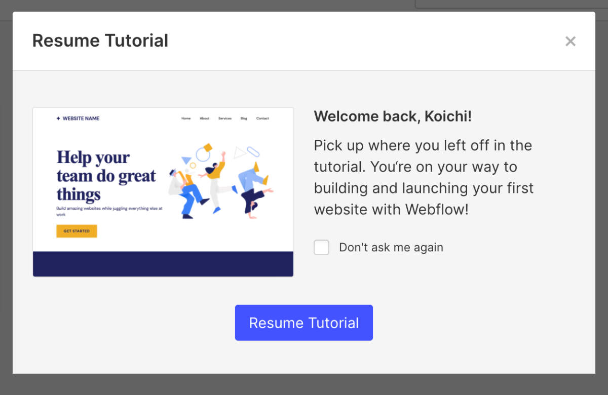 メールを開いて認証をすると、「おかえりなさい」と言われるので、そのまま「Resume Tutorial」ボタンをクリックしてチュートリアルを再開します。