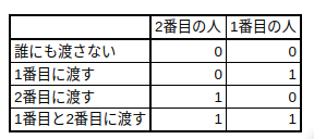 これらを、渡す場合=1、渡さない場合=0で表にしてみます。