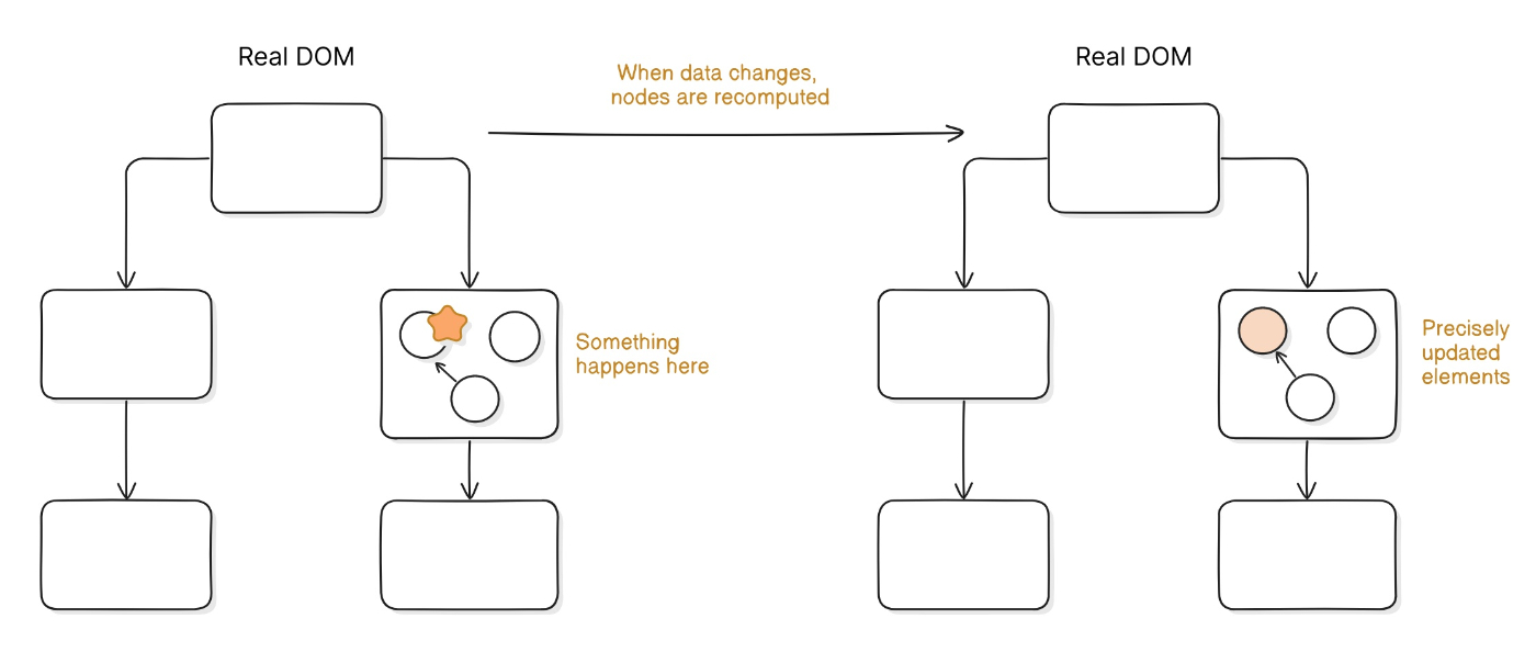 シグナルと Effect の依存関係により、更新は本当に必要な箇所だけに限定されます。countが変わっても、影響を受けるのは<span>のテキストノードだけで、<button>や<div>には何も起きません。