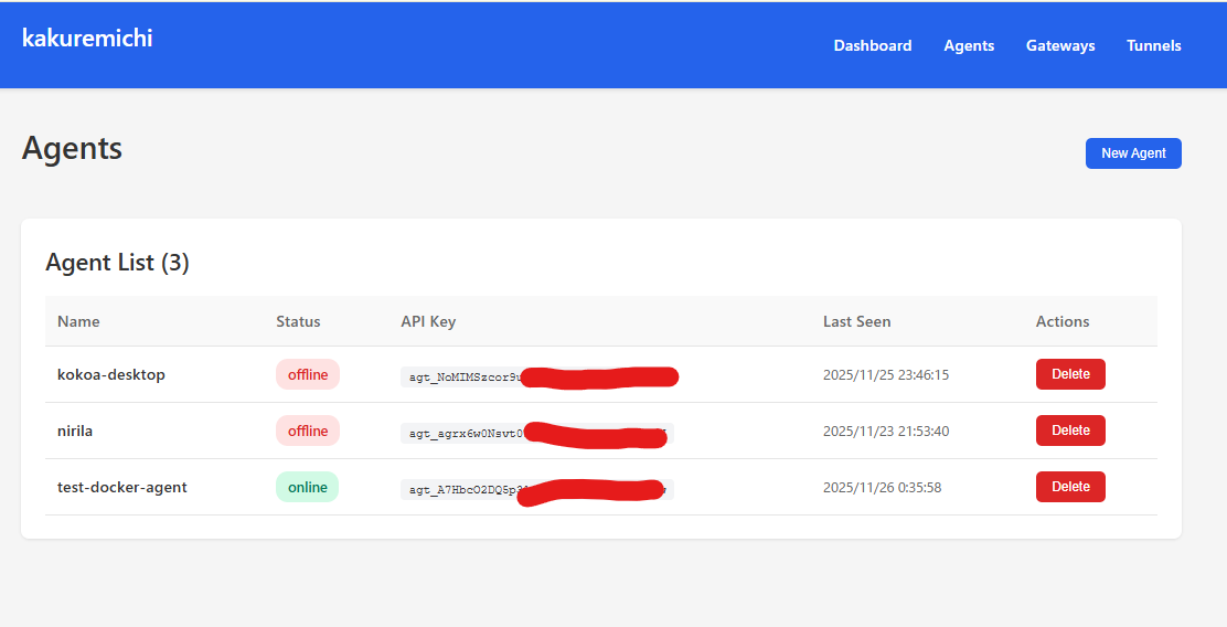 各Agentの接続状態(オンライン/オフライン)、割り当てられたサブネット、最終接続時刻などが確認できます。