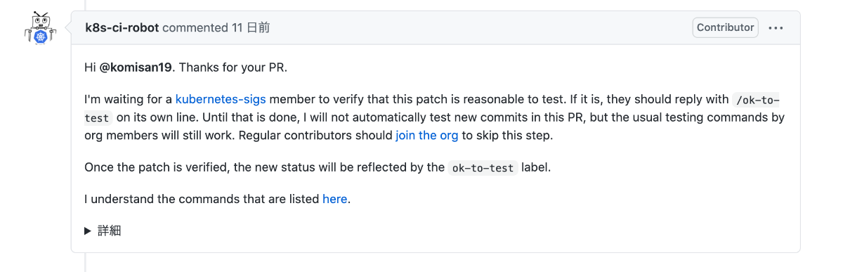 Pull Request を行うと勝手に CI が走ります。 aws-load-balancer-controller の場合このようなメッセージが表示されます。