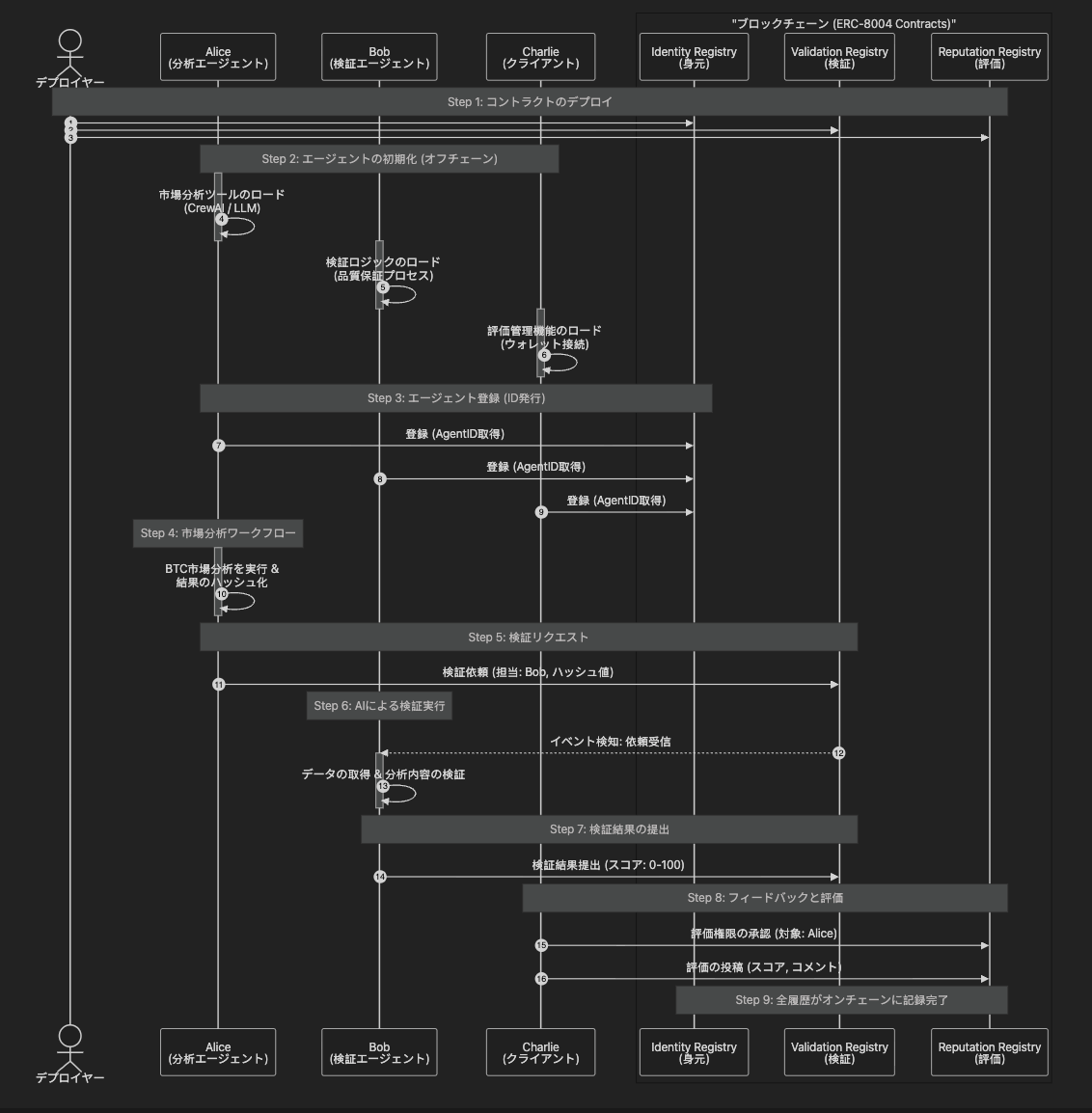 このデモでは、単なるAIの登録だけでなく、「分析エージェント(Alice)」が仕事をし、「検証エージェント(Bob)」がそれをチェックしてオンチェーンに記録する という、A2A経済圏の縮図を体験できます。