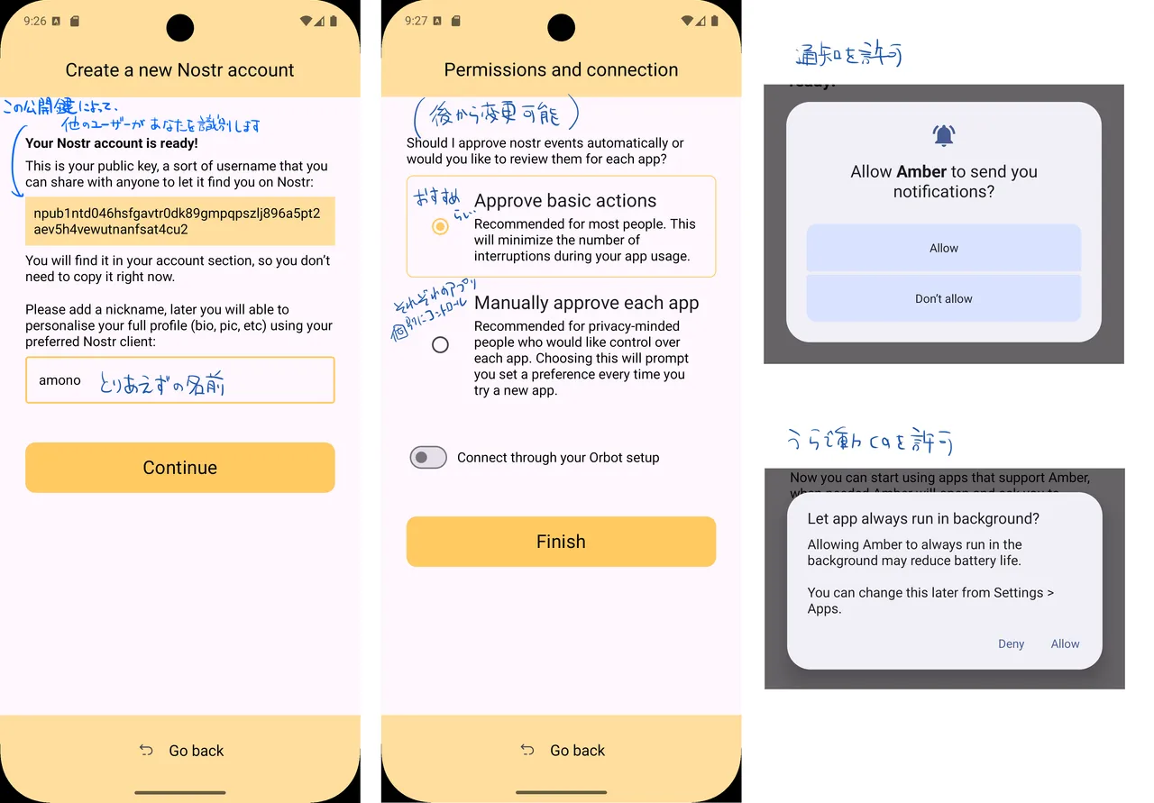 - 適当にニックネームを入れてContinueおしてなんか適当にFinish押して、通知の許可をして、バックグラウンドで動くことを許可する