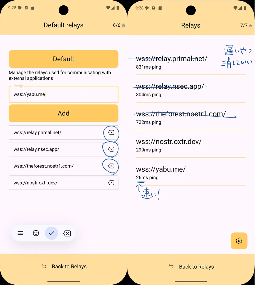 - 固有のリレー設定: モバイル通信環境でノスリたくて最低限のリレー設定でやっていきたいとき用(リレーの接続数が増えるほど通信料が増える)