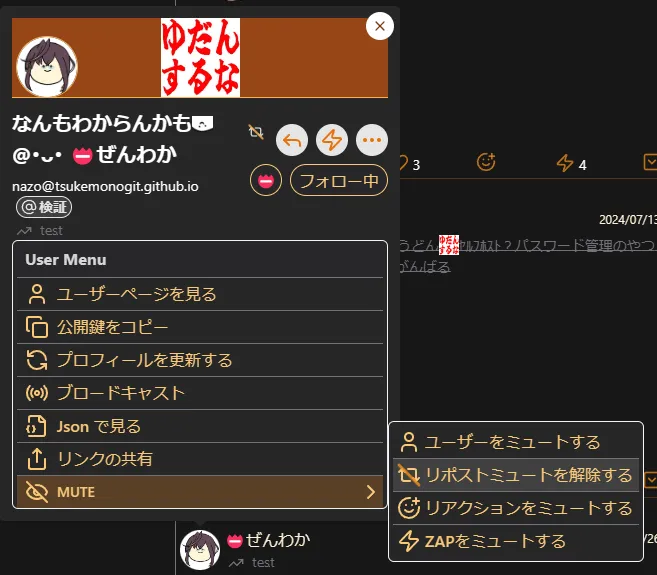 - アイコンの下にリレー情報:どのリレーから受信したかがわかる(各ノートの...メニューのJsonで見るを押したときのSeen Onに出てる情報)