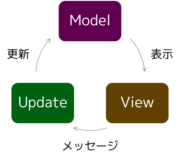Update は UI 上の入力等の Model に変更を起こすメッセージを受けて Model を更新する関数です。